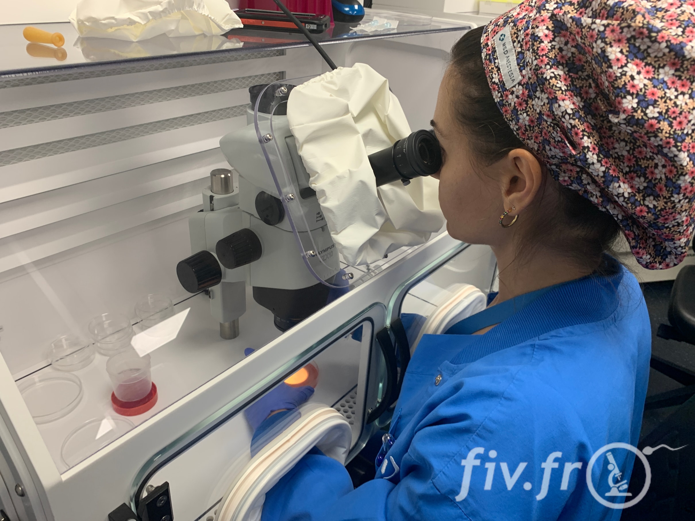 Vous voyez ensuite la laborantine chercher les ovocytes dans ce liquide est les isoler un à un.