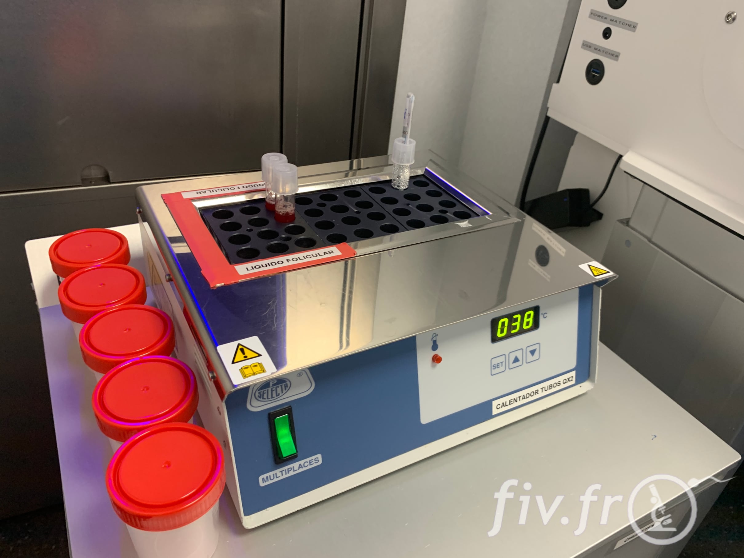Nous avons eu la chance de voir une laborantine travailler sur du travail folliculaire. Sur la 1ère photo, vous pouvez voir plusieurs tubes qui contiennent du liquide folliculaire suite à la ponction. Il sont gardés au chaud à 38 degrés comme l’indicateur de température en bas à droite le montre.